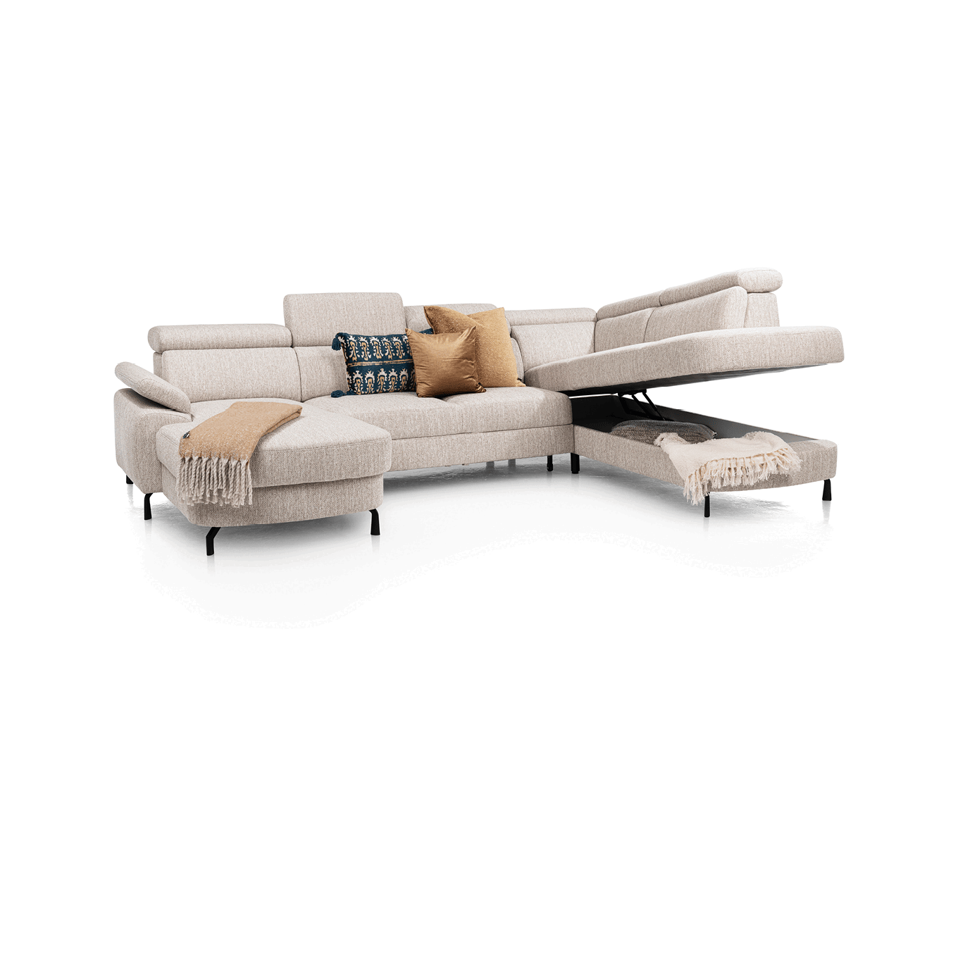 Besoin de rangement ? Composez un canapé d’angle avec une grande ottomane ou une chaise longue équipée d’un coffre de rangement intégré. Pratique pour avoir plaids, coussins ou magazines à portée de main… mais bien cachés.